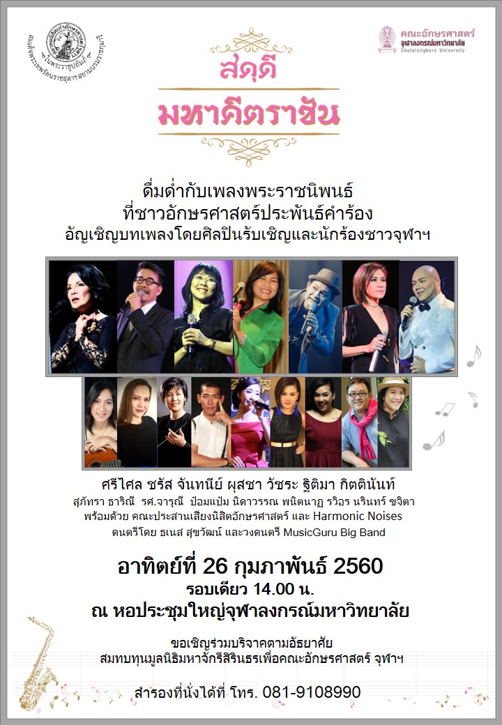 ด้วยความสำนึกในพระมหากรุณาธิคุณเป็นล้นพ้น สมาคมนิสิตเก่าคณะอักษรศาสตร์ จุฬาฯ จึงจัดงาน “สดุดีมหาคีตราชัน” ขึ้น เมื่อวันที่ 26 กุมภาพันธ์ 2560 ณ หอประชุมจุฬาลงกรณ์มหาวิทยาลัย เพื่ออัญเชิญบทเพลงพระราชนิพนธ์ที่ชาวอักษรฯ ได้รับเกียรติอันสูงสุดที่ได้มีส่วนร่วมในการประพันธ์เพลงพระราชนิพนธ์