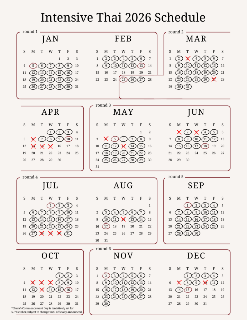 *Applicants with prior knowledge of Thai are required to take a placement test. After application, please email to ctfl@chula.ac.th to request for the online test.