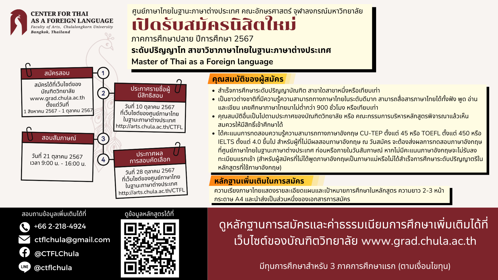 The next semester will start in January 2026 (on-site). Apply for the program here or at www.register.gradchula.com (Deadline for application is on August 1, 2025)