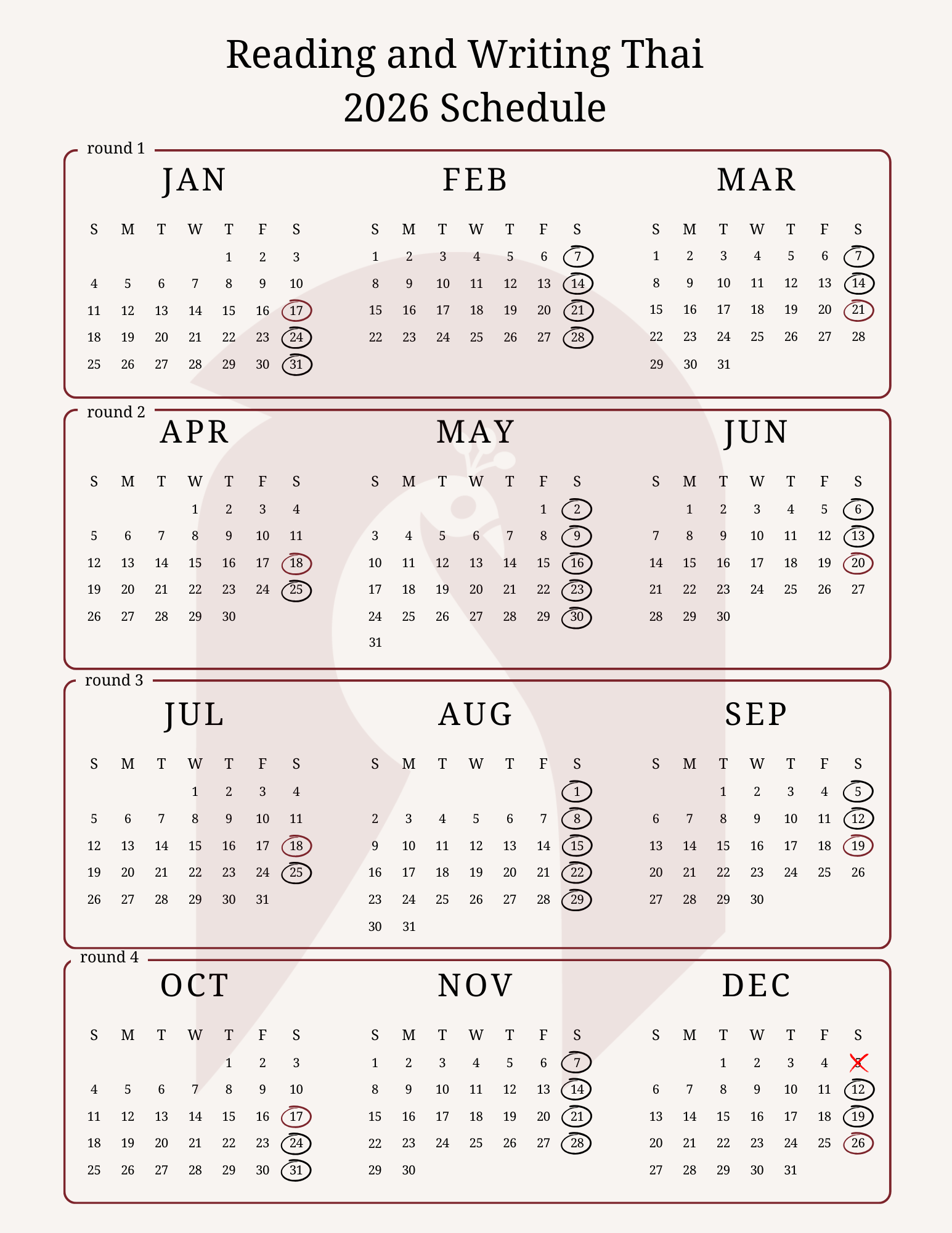 Reading and Writing Thai (I) (30 hours) focuses on the alphabet system, i.e., students will learn how to compose consonants, vowels and tone markers, forming words, and then pronounce