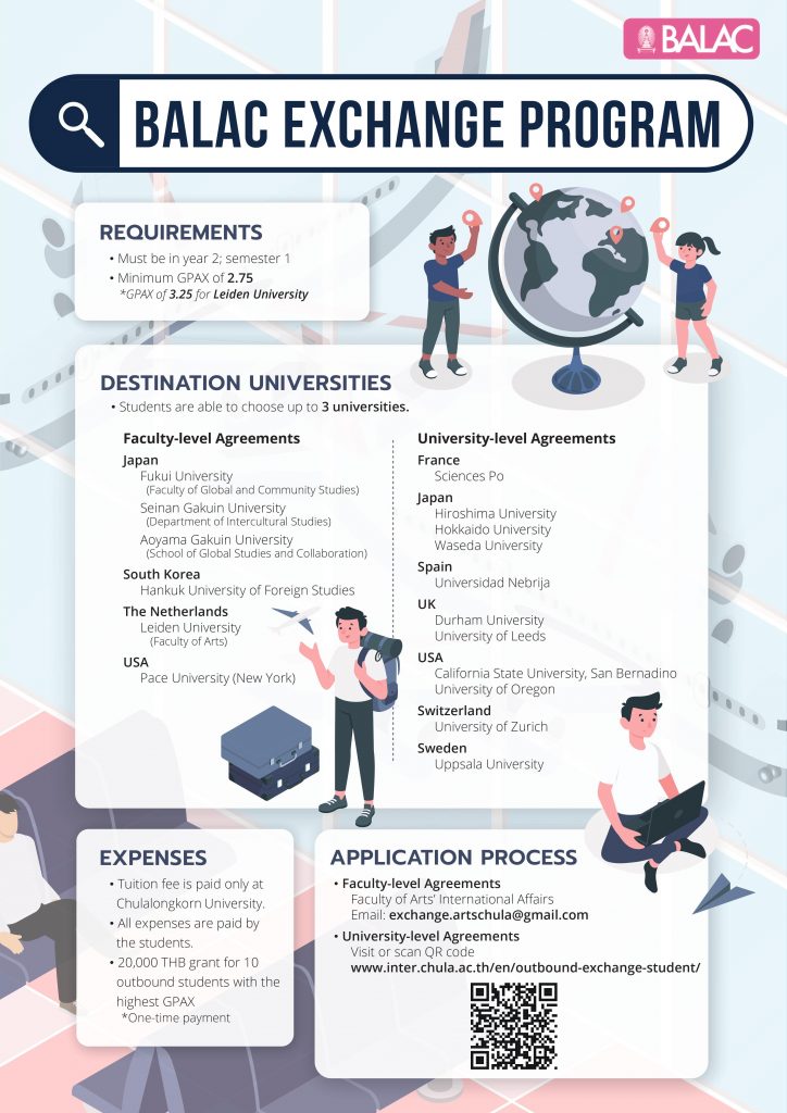 Visit https://www.arts.chula.ac.th/eng/index.php/outbound-student-exchange/ for more details. Qualifications, Procedures, for Applying for the Outbound Exchange Program