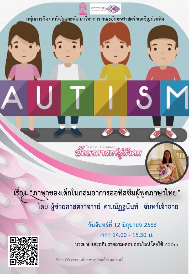 Dr. Nattanun Chanchaochai gave a talk on the language use of Thai-speaking children diagnosed with autism via the Zoom platform on 12th June 2023. The event was coordinated by the research affairs division of Chulalongkorn University’s Faculty of Arts.