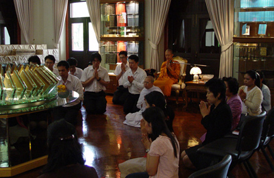 การจัดตั้งหอพระไตรปิฎกนานาชาติมีที่มาจากท่านผู้หญิง ม.ล.มณีรัตน์ บุนนาค อดีตผู้แทนนิสิตหญิงคณะอักษรศาสตร์และอักษรศาสตรบัณฑิต รุ่นปี ๒๔๙๐ ในฐานะประธานกองทุนสนทนาธรรมนำสุขในพระสังฆราชูปถัมภ์ ได้มอบคลังพระไตรปิฎกนานาชาติเป็นธรรมบรรณาการแก่คณะอักษรศาสตร์ ทั้งนี้สมเด็จพระญาณสังวร สมเด็จพระสังฆราช สกลมหาสังฆปริณายก ได้เสด็จทรงเป็นประธานในพิธีประดิษฐานคลังพระไตรปิฎกนานาชาติ เมื่อวันที่ ๒๐ กันยายน ๒๕๔๓ ซึ่งตรงกับวันคล้ายวันพระบรมราชสมภพในพระบาทสมเด็จพระจุลจอมเกล้าเจ้าอยู่หัวและพระบาทสมเด็จพระเจ้าอยู่หัวอานันทมหิดล