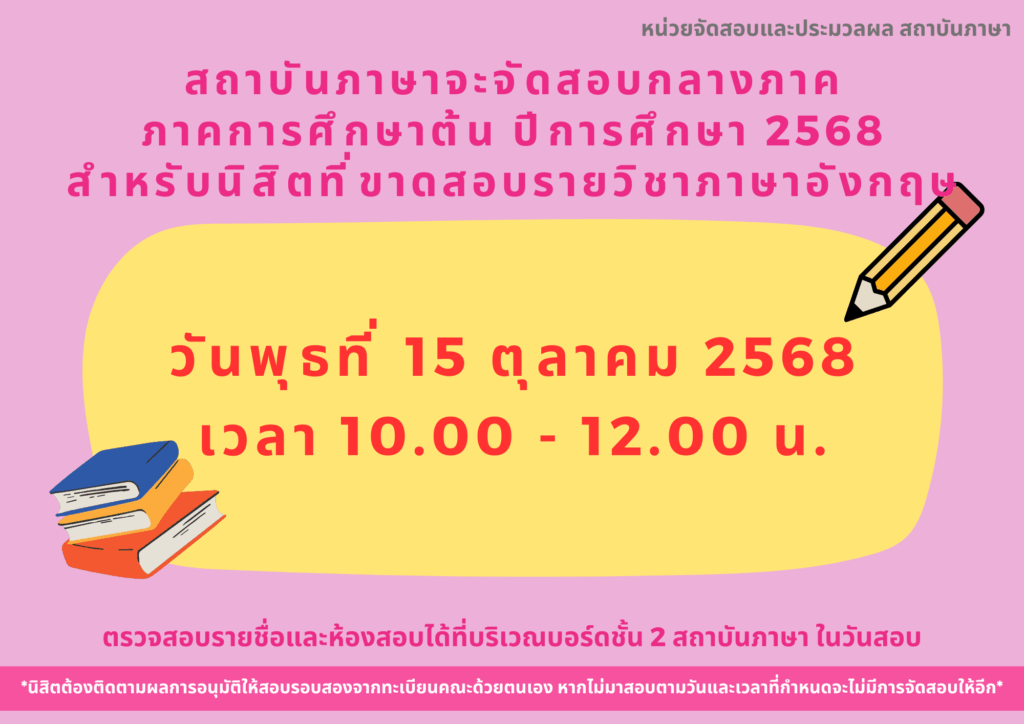 ประชาสัมพันธ์การจัดสอบกลางภาค วิชาภาษาอังกฤษของสถาบันภาษา ภาคการศึกษาต้น ปีการศึกษา2568 สำหรับนิสิตที่ขาดสอบ