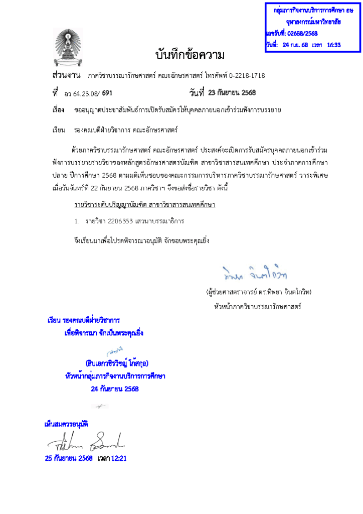 ประชาสัมพันธ์การเปิดรับสมัครให้บุคคลภายนอกเข้าร่วมฟังการบรรยายรายวิชาระดับบัณฑิตศึกษา ภาควิชาบรรณารักษศาสตร์ สำหรับผู้ที่สนใจสามารถติดต่อได้ที่ ภาควิชาบรรณารักษศาสตร์ คณะอักษรศาสตร์ จุฬาลงกรณ์มหาวิทยาลัย หมายเลขโทรศัพท์ 02-218-1718