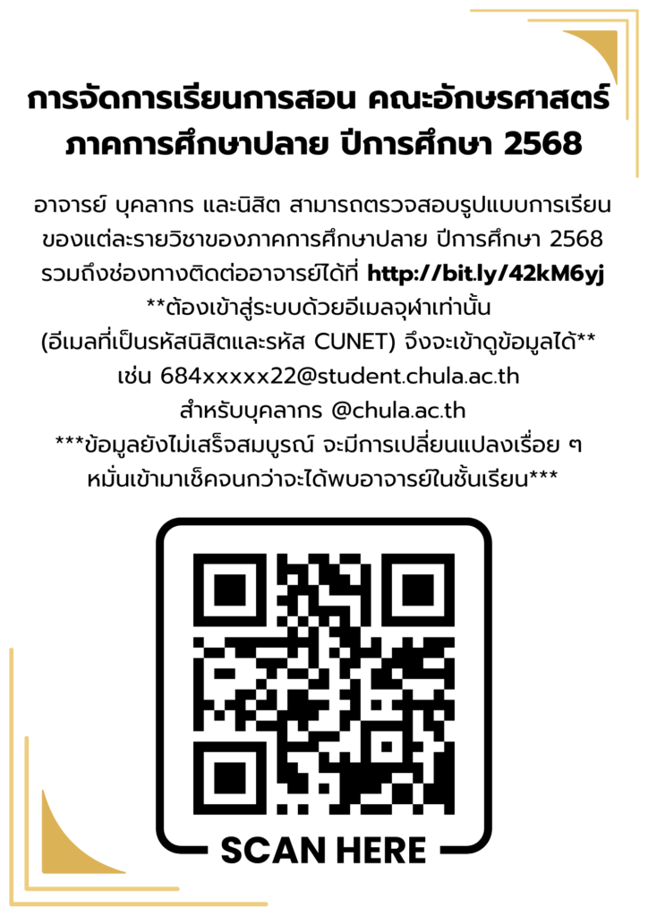 อาจารย์ บุคลากร และนิสิต สามารถตรวจสอบรูปแบบการเรียน ของแต่ละรายวิชาของภาคการศึกษาปลาย ปีการศึกษา 2568 รวมถึงช่องทางติดต่ออาจารย์ได้ที่ http://bit.ly/42kM6yj **ต้องเข้าสู่ระบบด้วยอีเมลจุฬาเท่านั้น (อีเมลที่เป็นรหัสนิสิตและรหัส CUNET)