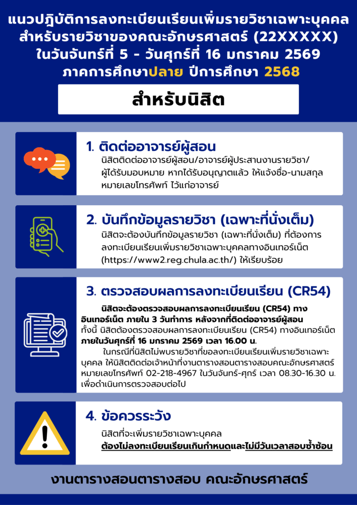 แนวปฎิบัติการลงทะเบียนเรียน เพิ่มรายวิชาเฉพาะบุคคล สำหรับรายวิชาของคณะอักษรศาสตร์ (22XXXXX) ภาคการศึกษาปลาย ปีการศึกษา 2568