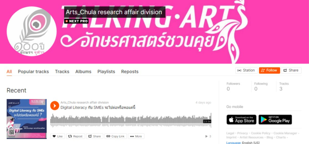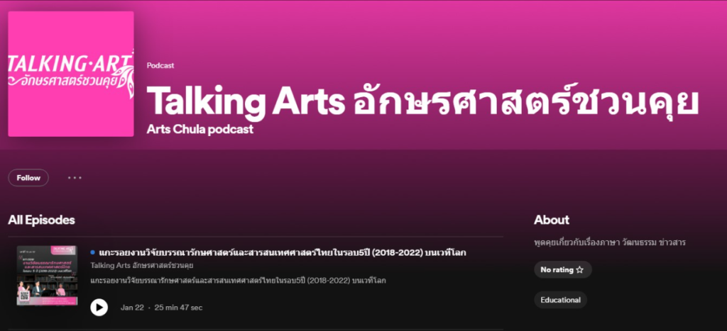 เพื่อต้อนรับปี 2567 รายการวิทยุอักษรพาที ปรับโฉมรายการใหม่เป็น “Talking Arts: อักษรศาสตร์ชวนคุย” จัดโดยกลุ่มภารกิจงานวิจัยและพัฒนาวิชาการ เพื่อเผยแพร่ผลงานวิจัยของคณาจารย์และนิสิตระดับบัณฑิตศึกษาท่านสามารถติดตามรายการได้ทุกเช้าวันเสาร์ เวลา 08.05 – 08.30 น. ทางสถานีวิทยุจุฬาฯ FM 101.5 MHz (CU Radio) และในรูปแบบ Podcast บน Spotify และ Soundcloud