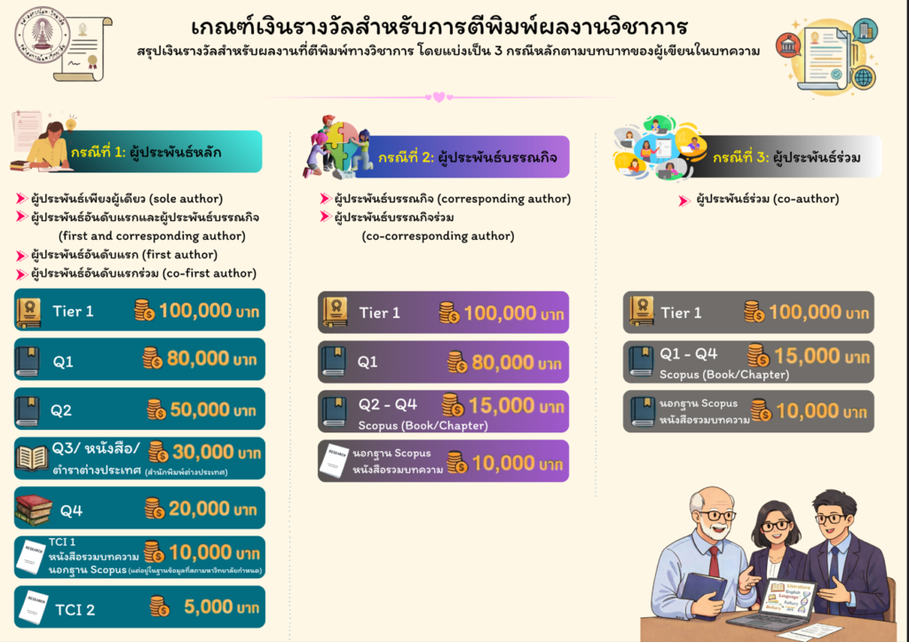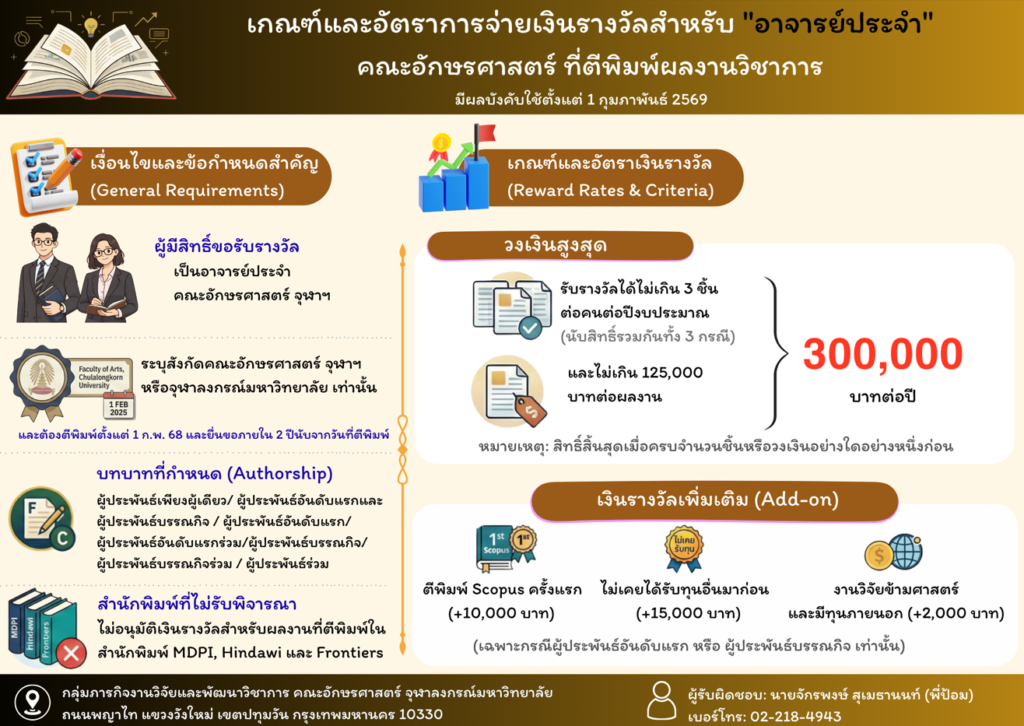 - ประกาศคณะอักษรศาสตร์ เรื่อง เกณฑ์และอัตราการจ่ายเงินรางวัลสำหรับคณาจารย์และนักวิจัยพันธมิตร คณะอักษรศาสตร์ที่ตีพิมพ์ผลงานของกองทุนเพื่อการวิจัยของคณะอักษรศาสตร์ พ.ศ. 2569