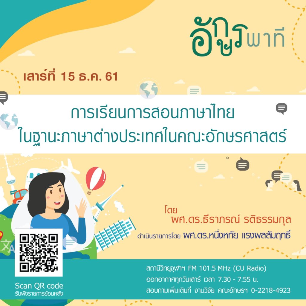 รายการอักษรพาที คณะอักษรศาสตร์ ผลงานที่ออกอากาศ ประจำปี 2561 Search Search ผลงานที่ออกอากาศ ประจำปี 2561 โปสเตอร์ เรื่อง วิทยากร วัน / เดือน / ปี รับฟัง การแปลบทละครเวทีเรื่อง “The Bear” และ “The Proposal” ของ Anton Checkov เพื่อจัดแสดงสำหรับผู้ชมชาวไทย ผศ.ดร.ปริดา มโนมัยพิบูลย์ 29 ธันวาคม 2561 การสวดมนต์ในพระบรมราชูปถัมภ์ ผศ.ดร.อาทิตย์ ชีรวณิชย์กุล 22 ธันวาคม 2561 การเรียนการสอนภาษาไทยในฐานะภาษาต่างประเทศในคณะอักษรศาสตร์ ผศ.ดร.หนึ่งหทัย แรงผลสัมฤทธิ์ 15 ธันวาคม 2561 เครื่องแปลภาษาอัตโนมัติ อ.ดร.อรรถพล ธำรงรัตนฤทธิ์ 8 ธันวาคม 2561 อิทธิพลภาษาเขมรในภาษาไทย: การเลือกรับหรือการแทรกแซง ผศ.ดร.พิทยาวัฒน์ พิทยาภรณ์ 1 ธันวาคม 2561 อิทธิพลของภาษาต่อการรับรู้ชื่อแบรนด์ อ.ดร.ศุจิณัฐ จิตวิริยนนท์ 24 พฤศจิกายน 2561 ความเป็นชาติกับการเลือกใช้ภาษาในประเทศสิงคโปร์ อ.ดร.ภาวดี สายสุวรรณ 17 พฤศจิกายน 2561 “ช่างศิลป์อิตาเลียนในสยาม” : จากวิจัยสู่การสร้างเนื้อหาดิจิตัลกับ The Arc of Memory รศ.ดร.หนึ่งฤดี โลหผล 10 พฤศจิกายน 2561 ความทรงจำทางวัฒนธรรมร่วมระหว่างสยาม-อิตาลี* รศ.ดร.หนึ่งฤดี โลหผล 3 พฤศจิกายน 2561 ภาพจิตรกรรม “สาวน้อยนักอ่าน” ของฟรากอนา ผศ.ดร.พิริยะดิศ มานิตย์ 27 ตุลาคม 2561 แฟชั่นสตรีอิตาเลียนในยุค Fascist อ.ดร.ปาจรีย์ ทาชาติ 20 ตุลาคม 2561 เรื่องตลกพื้นบ้านเยอรมัน ศาสตราจารย์ พิเศษ ดร.อำภา โอตระกูล 13 ตุลาคม 2561 ความสำคัญของภาษารัสเซียในปัจจุบัน อ.ดร.ชนันพร เหมสกุล 6 ตุลาคม 2561 สัจจนิยมมหัศจรรย์ในลาตินอเมริกา ผศ.ดร.ภาสุรี ลือสกุล 29 กันยายน 2561 เรื่องเล่าในจารึก มองจารึกหลักที่ 1 ด้วยศาสตร์แห่งการเล่าเรื่อง อ.ดร.น้ำผึ้ง ปัทมะลางคุณ 22 กันยายน 2561 เอกสารภาษาสเปนเกี่ยวกับการเสด็จประพาสราชอาณาจักรสเปน ของ พระบาทสมเด็จพระจุลจอมเกล้าเจ้าอยู่หัว ศ.ดร.สถาพร ทิพยศักดิ์ 15 กันยายน 2561 ลักษณะการสนทนาในภาษาไทย รศ.ดร.ณัฐพร พานโพธิ์ทอง 8 กันยายน 2561 การศึกษาคำบอกเวลาในภาษาไทยถิ่นกลาง อ.ดร.มิ่งมิตร ศรีประสิทธิ์ 1 กันยายน 2561 พุทธประวัติในกวีนิพนธ์ไทยร่วมสมัย ผศ.ดร.อาทิตย์ ชีรวณิชย์กุล 25 สิงหาคม 2561 ความสำคัญของเรื่องอิเหนาสมัยรัชกาลที่ 5 ผศ.ดร.ธานีรัตน์ จัตุทะศรี 18 สิงหาคม 2561 การสอนในประเทศญี่ปุ่น อ.ดร.ธีรนุช โชคสุวณิช 11 สิงหาคม 2561 ความเปรียบแปลกใหม่ในพระอภัยมณี ศ.ดร.ชลดา เรืองรักษ์ลิขิต 4 สิงหาคม 2561 ครการสู่ความเป็นเลิศด้านภาษาและวรรณคดีไทย อ.หัตถกาญจน์ อารีศิลป 28 กรกฎาคม 2561 การจัดการความรู้ VS การจัดการความรัก การพัฒนาการจัดการความรู้ในองค์กร อ.ดร.เสาวภา หลิมวิจิตร 21 กรกฎาคม 2561 linked data: ความพยายามเชื่อมโยงชุดข้อมูลในโลกดิจิทัล ผศ.ดร.สมศักดิ์ ศรีบริสุทธิ์สกุล 14 กรกฎาคม 2561 