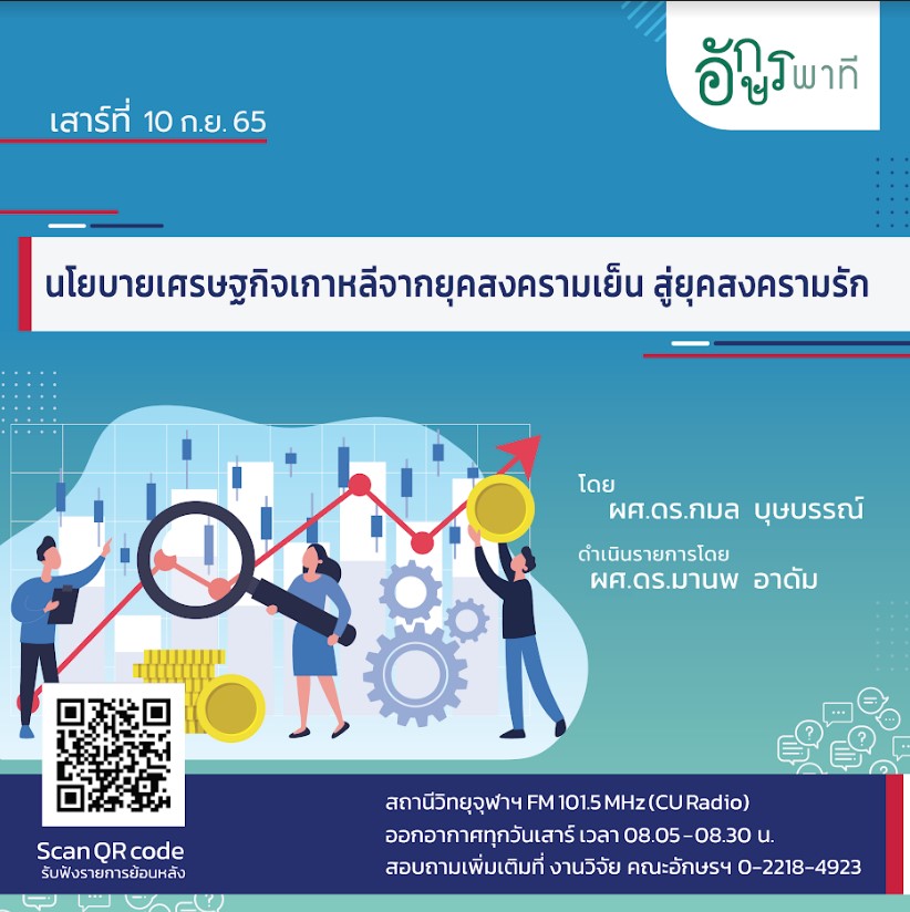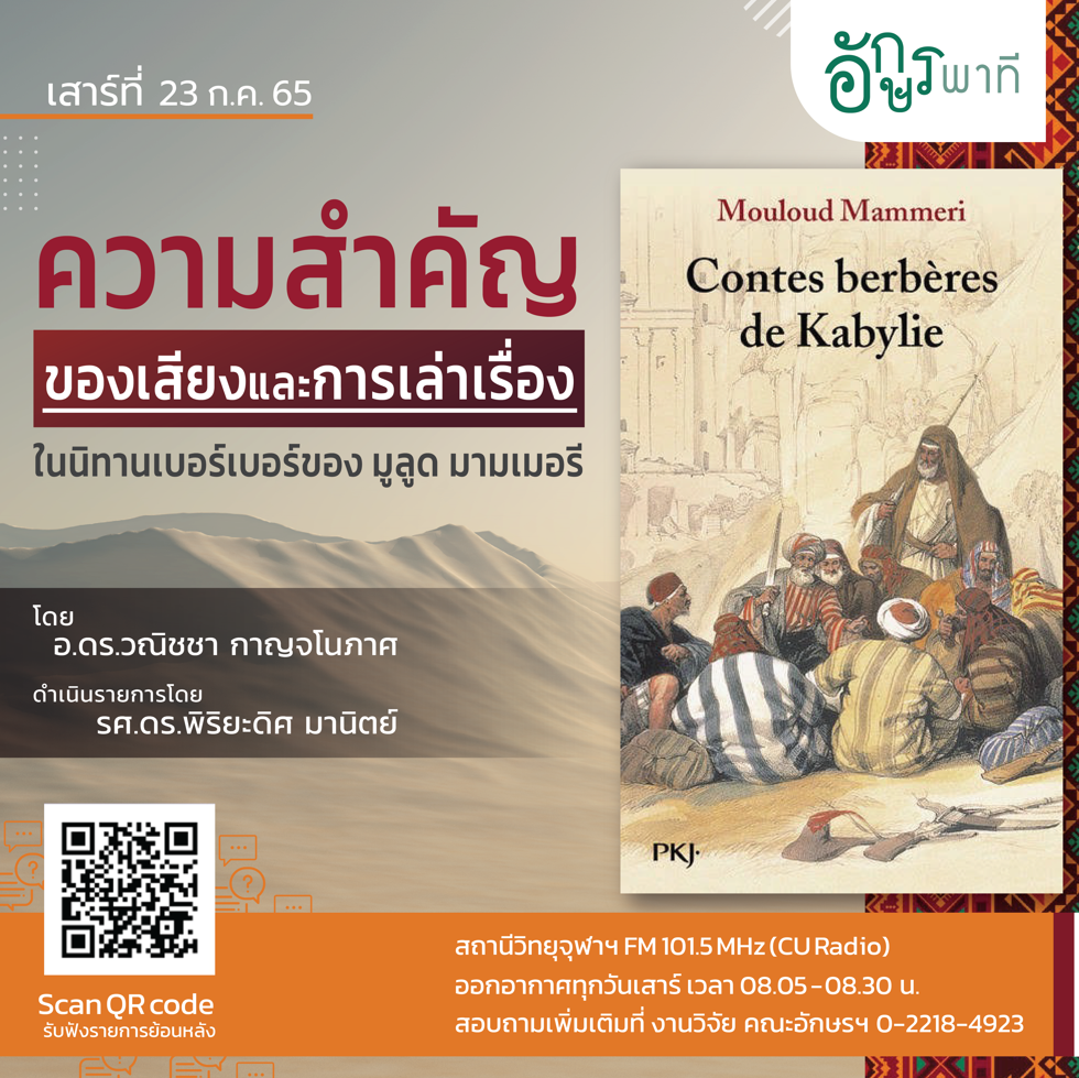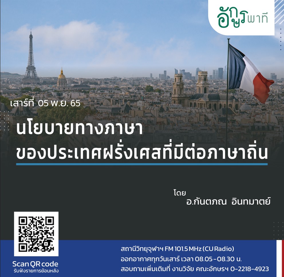 รายการอักษรพาที คณะอักษรศาสตร์ ผลงานที่ออกอากาศ ประจำปี 2565 Search Search ผลงานที่ออกอากาศ ประจำปี 2565 โปสเตอร์ เรื่อง วิทยากร วัน / เดือน / ปี รับฟัง เทศกาลขึ้นปีใหม่ของญี่ปุ่น ผศ.ดร.อัษฎายุทธ ชูศรี 31 ธันวาคม 2565 ภูมิทัศน์วรรณา: ป่าและอารมณ์ในวรรณคดีลาว อ.ดร.ชัยรัตน์ พลมุข 24 ธันวาคม 2565 ความโกรธกับความยุติธรรมทางสังคม อ.ดร.ทิพพาพันธุ์ เขื้อสวัสดิ์ 17 ธันวาคม 2565 อิบเซ่นกับผู้หญิงสมัยใหม่ ผศ.ดร.ทอแสง เชาว์ชุติ 10 ธันวาคม 2565 หลากมุมมองเรื่องของ “น้ำ” ในบทลำนำภาษาสันสกฤต อ.ดร.อรุณวรรณ คงมีผล 3 ธันวาคม 2565 การเติบโตของวงการซีรีย์เกาหลี ผศ.ดร.กมล บุษบรรณ์ 26 พฤศจิกายน 2565 การเติบโตของวงการ E-sport เกาหลี ผศ.ดร.กมล บุษบรรณ์ 19 พฤศจิกายน 2565 อิเหนา มรดกวรรณคดีที่ยังมีชีวิต รศ.ดร.ธานีรัตน์ จัตุทะศรี 12 พฤศจิกายน 2565 นโยบายทางภาษาของประเทศฝรั่งเศส ที่มีต่อภาษาถิ่น อ.กันตภณ อินทมาตย์ 5 พฤศจิกายน 2565 บันทึกท่องเที่ยวหญิงในเรื่องเล่าการเดินทางไทย ผศ.ดร.เพิ่มทิพย์ บัวเพ็ชร์ 29 ตุลาคม 2565 การปรับแปลงมโนทัศน์ประชาธิปไตยของฌอง-ลุค นองซี คุณกมลกา จิตตรุทธะ 22 ตุลาคม 2565 ความทรงจำและการนำเสนออดีต ใน ปอล ริเคอร์ คุณเจษฎากร บุญครองธรรม 15 ตุลาคม 2565 การศึกษาวิทยาศาสตร์ในสุนทรียศาสตร์ (Aesthetic Science) ผศ. ธิดาวดี สกุลโพน 8 ตุลาคม 2565 กระแสเกาหลียั่งยืนได้อย่างไร วิเคราะห์ผ่าน 6Ps โมเดล ผศ.ดร.กมล บุษบรรณ์ 1 ตุลาคม 2565 การเรียนการสอนด้านเกาหลีศึกษาในประเทศไทย ผศ.ดร.กมล บุษบรรณ์ 24 กันยายน 2565 นโยบายด้านกระแสเกาหลีหลังวิกฤตต้มยำกุ้ง (1997 Asian financial crisis) ผศ.ดร.กมล บุษบรรณ์ 17 กันยายน 2565 นโยบายเศรษฐกิจเกาหลีจากยุคสงครามเย็น สู่ยุคสงครามรัก ผศ.ดร.กมล บุษบรรณ์ 10 กันยายน 2565 การศึกษาความเปราะบางชายฝั่ง: กรณีศึกษาจังหวัดนครศรีธรรมราชและกระบี่ รศ.ดร.พรรณี ชีวินศิริวัฒน์ 3 กันยายน 2565 แนวคิดเรื่องการอุทิศบุญในสังคมไทย พระมหาอนุกูล เงางาม 27 สิงหาคม 2565 ความทุกข์กับเนื้อหนังในความคิดของเอมมานูเอล ฟาลค์ คุณเกรียงศักดิ์ประสูตร์แสงจันทร์ 20 สิงหาคม 2565 “นิรุกติศาสตร์” ในห้องเรียนภาษาไทยสำหรับชาวต่างชาติ (ครั้งที่ 2) ผศ.ดร.วิภาส โพธิแพทย์ 13 สิงหาคม 2565 “นิรุกติศาสตร์” ในห้องเรียนภาษาไทยสำหรับชาวต่างชาติ (ครั้งที่ 1) อ.ดร.ใกล้รุ่ง อิโซ 6 สิงหาคม 2565 ความยากในการทำวิจัยพุทธปรัชญา อ.ดร.ใกล้รุ่ง อิโซ 30 กรกฎาคม 2565 ความสำคัญของเสียงและการเล่าเรื่องในนิทานเบอร์เบอร์ของ มูลูด มามเมอรี อ.ดร.วณิชชา กาญจโนภาศ 23 กรกฎาคม 2565 ฝรั่งช่างศิลป์ ในยุคดิจิทัล รศ.ดร.หนึ่งฤดี โลหผล 16 กรกฎาคม 2565 บันทึกการเดินทางของนักเขียนเจเนอเรชั่นวาย ผศ.อรสุธี ชัยทองศรี 9 กรกฎาคม 2565 บาดแผลสงครามเวียดน