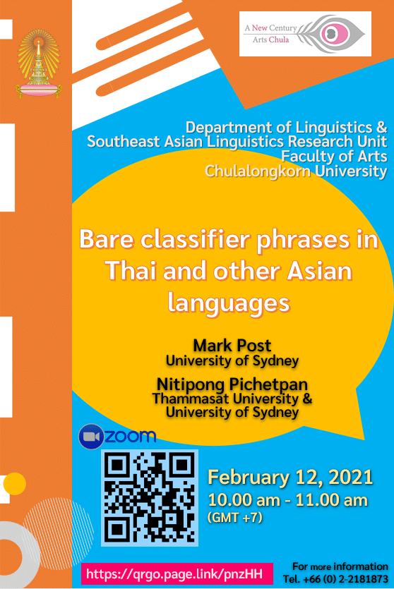 The Department of Linguistics and the Southeast Asian Linguistics Research Unit, Faculty of Arts, Chulalongkorn University cordially invite you to attend a special lecture: “Bare classifier phrases in Thai and other Asian languages” …