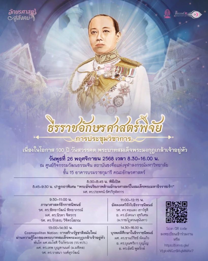 กลุ่มภารกิจงานวิจัยและพัฒนางานวิชาการ คณะอักษรศาสตร์ จุฬาลงกรณ์มหาวิทยาลัย ขอเชิญฟังบรรยายในโครงการอักษรศาสตร์สู่สังคม การประชุมวิชาการ เรื่อง “ธีรราชอักษรศาสตร์พิจัย”เนื่องในโอกาส 100 ปี วันสวรรคต พระบาทสมเด็จพระมงกุฎเกล้าเจ้าอยู่หัว——————————————-เวลา 8.45 – 9.30 น. “ปาฐกถาพิเศษ”พระอัจฉริยภาพด้านอักษรศาสตร์ในสมเด็จพระมหาธีรราชเจ้าวิทยากร: ผู้ช่วยศาสตราจารย์ ดร.ประพจน์ อัศววิรุฬหการ——————————————-เวลา 9.30-11.00 น. “ภาษาศาสตร์ธีรราชนิพนธ์” พินิจรูปสระและอักขรวิธีไทยแบบใหม่ในธีรราชดำริจากมุมมองภาษาศาสตร์วิทยากร: รองศาสตราจารย์ ดร.พิทยาวัฒน์ พิทยาภรณ์ การใช้ประโยคกรรมวาจกในพระราชหัตถเลขาภาษาอังกฤษในรัชกาลที่ 6: อิทธิพลแบบแผนการเขียนจดหมายยุคเอ็ดเวอร์เดียนวิทยากร: ผู้ช่วยศาสตราจารย์ ดร.นิรดา จิตรกร บทบาทของคำกริยาวิเศษณ์ในพระราชหัตถเลขาในรัชกาลที่ 6 ถึงคหบดีแห่งชนบทอังกฤษ: อัตลักษณ์ อำนาจ และการจัดการความสัมพันธ์วิทยากร: รองศาสตราจารย์ ดร.รักสงบ วิจิตรโสภณ——————————————-เวลา 11.00 – 12.15 น. “อัสดงคตวิถีกับธีรราชนิพนธ์” พระบาทสมเด็จพระมงกุฎเกล้าเจ้าอยู่หัวกับวรรณกรรมสืบสวนสอบสวนยุคแรกของไทยวิทยากร: รองศาสตราจารย์ ดร.ทอแสง เชาว์ชุติ อิทธิพลของนวนิยายชุดเชอร์ล็อคโฮล์มส์ที่มีต่อนิทานทองอินวิทยากร: อาจารย์ ดร.อังคณา สุขวิเศษ (ม.ราชภัฏสวนสุนันทา)——————————————-เวลา […]