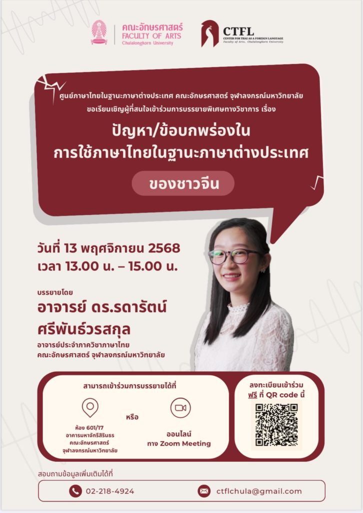 ขอเรียนเชิญคณาจารย์ นิสิต และผู้ที่สนใจเข้าร่วมฟังการบรรยายพิเศษทางวิชาการโดยผู้ทรงคุณวุฒิด้านภาษาไทยในฐานะภาษาต่างประเทศ ในหัวข้อ“ปัญหา/ข้อบกพร่องในการใช้ภาษาไทยในฐานะภาษาต่างประเทศของชาวจีน”Onsite และ online ผ่าน Zoom#หลักสูตรอักษรศาสตรมหาบัณฑิตสาขาวิชาภาษาไทยในฐานะภาษาต่างประเทศ ศูนย์ภาษาไทยในฐานะภาษาต่างประเทศ คณะอักษรศาสตร์ จุฬาลงกรณ์มหาวิทยาลัย