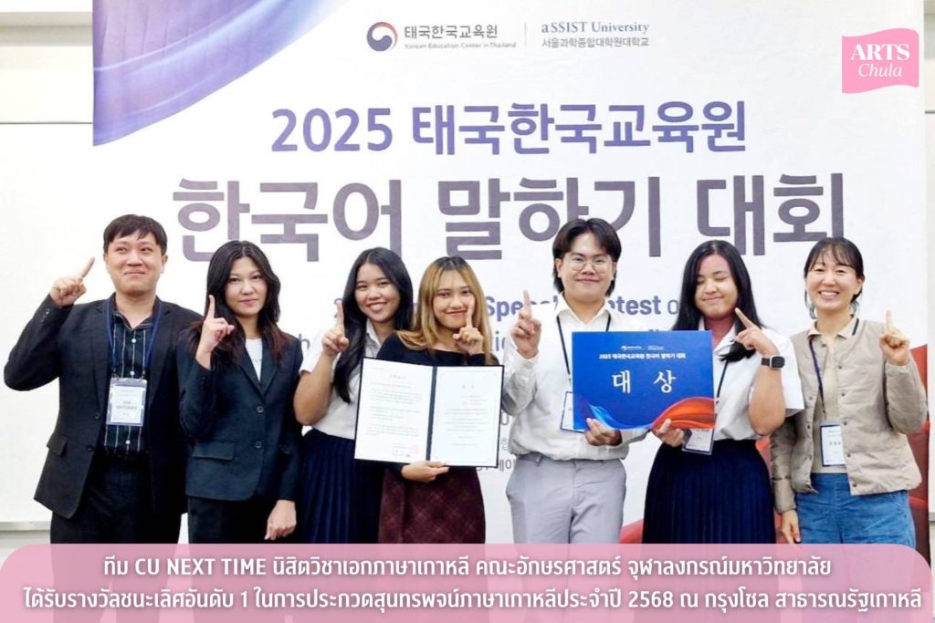 คณะอักษรศาสตร์ ขอแสดงความยินดีกับทีม CU NEXT TIME ของนิสิตวิชาเอกภาษาเกาหลี ที่ได้รับรางวัลชนะเลิศอันดับ 1 (대상) ในการประกวดสุนทรพจน์ภาษาเกาหลี ประจำปี 2568 (2025년 태국한국교육원 한국어 말하기 대회) เมื่อวันที่ 21 ตุลาคม 2568 ณ กรุงโซล สาธารณรัฐเกาหลี โดยมีรายชื่อนิสิต ดังนี้1. นายกษิดิศ เสนาเพ็ง ชั้นปี 32. นางสาวญาดา นามวัย ชั้นปี 33. นางสาวพิมพ์นิภา บำรุงศรี ชั้นปี 44. นางสาวศิครินทร์ บำรุงพืช ชั้นปี 45. นางสาวธนิดา คงเจริญ ชั้นปี 4
