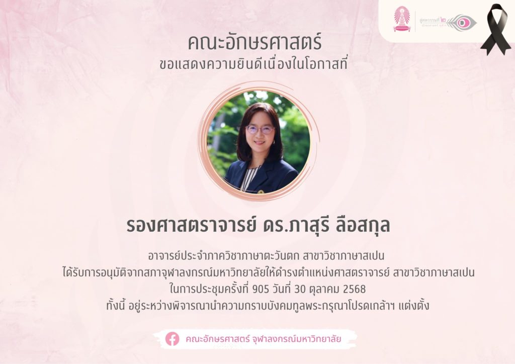 คณะอักษรศาสตร์ขอแสดงความยินดีในโอกาสที่รองศาสตราจารย์ ดร.ภาสุรี ลือสกุล สังกัดภาควิชาภาษาตะวันตก สาขาวิชาภาษาสเปน ได้รับการอนุมัติจากสภาจุฬาลงกรณ์มหาวิทยาลัย ในการประชุมครั้งที่ 905 วันที่ 30 ตุลาคม 2568 ให้ดำรงตำแหน่งศาสตราจารย์ สาขาวิชาภาษาสเปน ทั้งนี้ อยู่ระหว่างพิจารณานำความกราบบังคมทูลพระกรุณาโปรดเกล้าฯ แต่งตั้ง