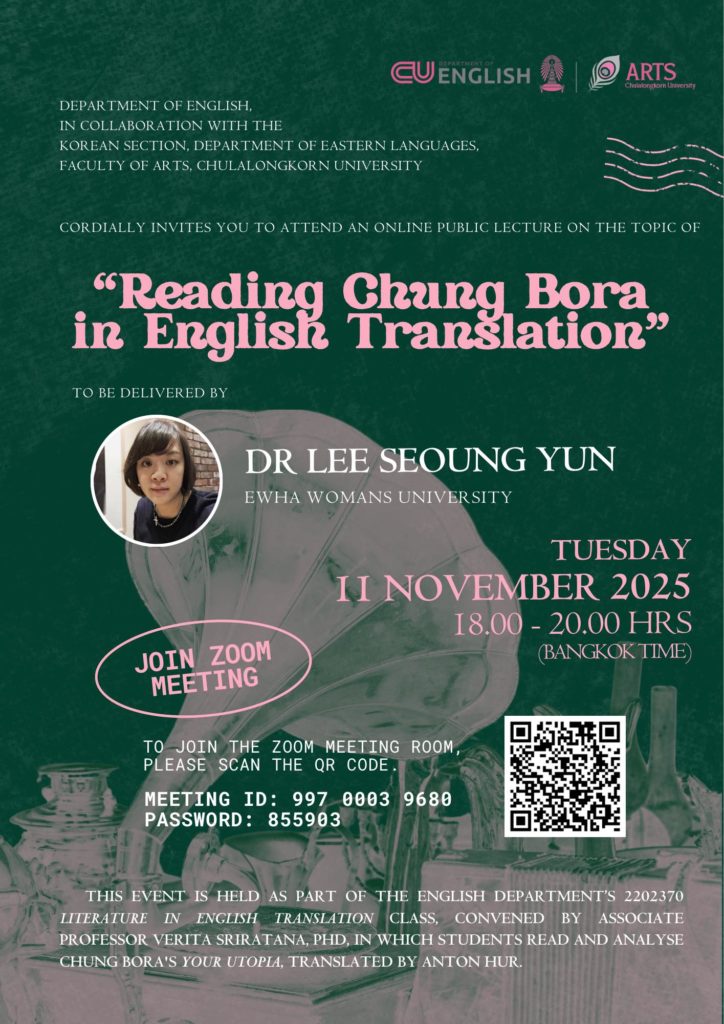 Department of English, in collaboration with the Korean Section, Department of Eastern Languages, Faculty of Arts, Chulalongkorn University, cordially invites you to attend an online public lecture on the topic of “Reading Chung Bora in English Translation” to be delivered by Dr Lee Seoung Yun (Ewha Womans University) Date: Tuesday 11 November 2025 Time: 18.00 […]