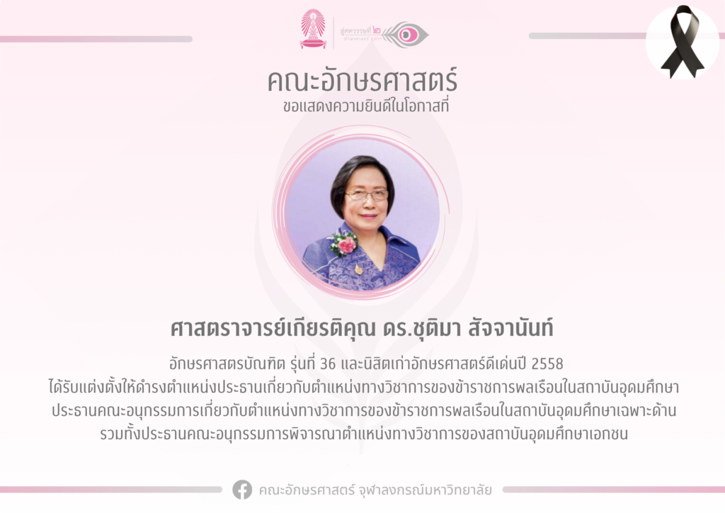 คณะอักษรศาสตร์ขอแสดงความยินดีเนื่องในโอกาสที่ศาสตราจารย์เกียรติคุณ ดร.ชุติมา สัจจานันท์ อักษรศาสตรบัณฑิต รุ่นที่36 และนิสิตเก่าอักษรศาสตร์ดีเด่น ปี 2558 ได้รับพิจารณาแต่งตั้งจากคณะกรรมการข้าราชการพลเรือนในสถาบันอุดมศึกษา (ก.พ.อ.) ที่มีรัฐมนตรีว่าการกระทรวงการอุดมศึกษา วิทยาศาสตร์ วิจัยและนวัตกรรม (อว.) เป็นประธาน ในการประชุมครั้งที่ 4/2568 วันที่ 29 ตุลาคม 2568 ให้ดำรงตำแหน่งประธานเกี่ยวกับตำแหน่งทางวิชาการของข้าราชการพลเรือนในสถาบันอุดมศึกษา ประธานคณะอนุกรรมการเกี่ยวกับตำแหน่งทางวิชาการของข้าราชการพลเรือนในสถาบันอุดมศึกษาเฉพาะด้าน รวมทั้งประธานคณะอนุกรรมการพิจารณาตำแหน่งทางวิชาการของสถาบันอุดมศึกษาเอกชน แทนศาสตราจารย์กิตติคุณ ดร.บวรศักดิ์ อุวรรณโณ ซึ่งขอลาออกจากการเป็น ก.พ.อ. ผู้ทรงคุณวุฒิ ไปดำรงตำแหน่งทางการเมืองเป็นรองนายกรัฐมนตรี