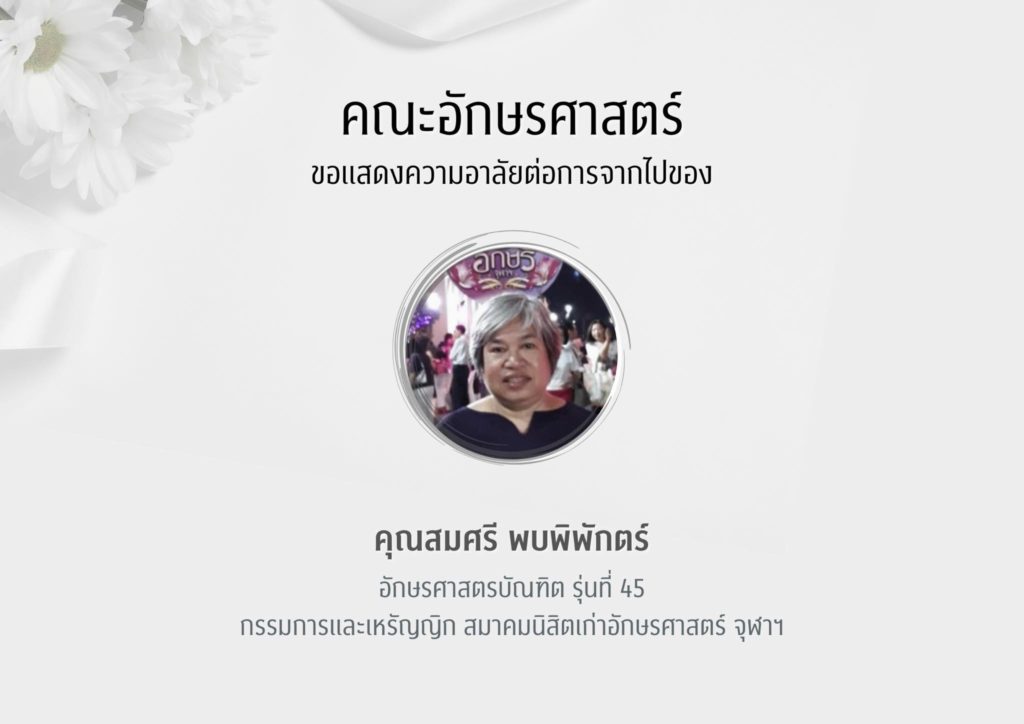 คณะอักษรศาสตร์ขอแสดงความอาลัยต่อการจากไปของ คุณสมศรี พบพิพักตร์ อักษรศาสตรบัณทิต รุ่นที่ 45 กรรมการและเหรัญญิก สมาคมนิสิตเก่าอักษรศาสตร์ จุฬาฯ และเป็นผู้ประสานงานบริหารด้านวัฒนธรรม สถานเอกอักครราชทูตอิตาลี ประจำประเทศไทย