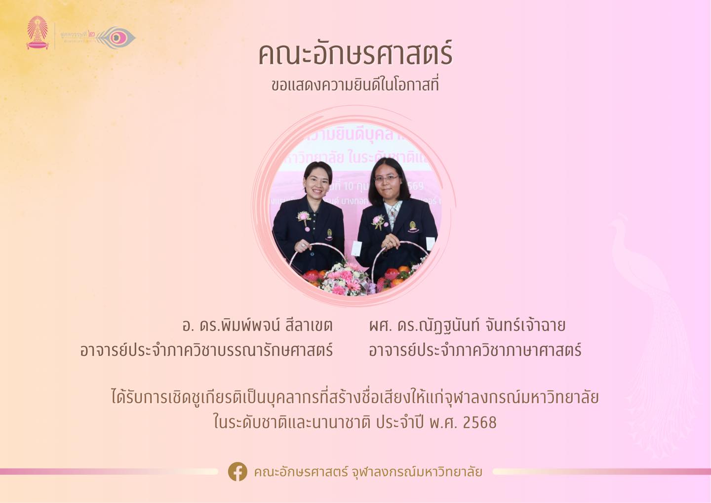 คณะอักษรศาสตร์ขอแสดงความยินดีในโอกาสที่ ผศ. ดร.ณัฏฐนันท์ จันทร์เจ้าฉาย อาจารย์ประจำภาควิชาภาษาศาสตร์ และ อ. ดร.พิมพ์พจน์ สีลาเขต อาจารย์ประจำภาควิชาบรรณารักษศาสตร์ ได้รับการเชิดชูเกียรติเป็นบุคลากรที่สร้างชื่อเสียงให้แก่จุฬาลงกรณ์มหาวิทยาลัย ในระดับชาติและนานาชาติ ประจำปี พ.ศ. 2568 ในปี 2568 อาจารย์และนักวิจัยของจุฬาลงกรณ์มหาวิทยาลัย สามารถสร้างชื่อเสียงและผลงานรวมทั้งหมด 273 รางวัล แบ่งเป็น รางวัลระดับนานาชาติ ประเภทบุคคล 61 คน รางวัลระดับนานาชาติ ประเภทผลงาน 103 ผลงาน รางวัลระดับชาติ ประเภทบุคคล 33 คน และรางวัลระดับชาติ ประเภทผลงาน 76 ผลงาน งานแสดงความยินดีแก่บุคลากรที่สร้างชื่อเสียงให้แก่จุฬาลงกรณ์มหาวิทยาลัยในระดับชาติและนานาชาติ จัดขึ้นเพื่อเป็นการเชิดชูเกียรติและแสดงความยินดีแก่อาจารย์และนักวิจัยของจุฬาลงกรณ์มหาวิทยาลัยที่สร้างชื่อเสียงในระดับชาติและนานาชาติ และแสดงความขอบคุณต่อคณาจารย์และบุคลากรที่สร้างผลงานโดดเด่นด้านวิชาการ งานวิจัย นวัตกรรม การบริหาร ตลอดจนเป็นการสร้างขวัญกำลังใจและกระตุ้นให้บุคลากรทางวิชาการมุ่งมั่นสร้างสรรค์ผลงานที่มีคุณภาพและเป็นประโยชน์ต่อสังคม