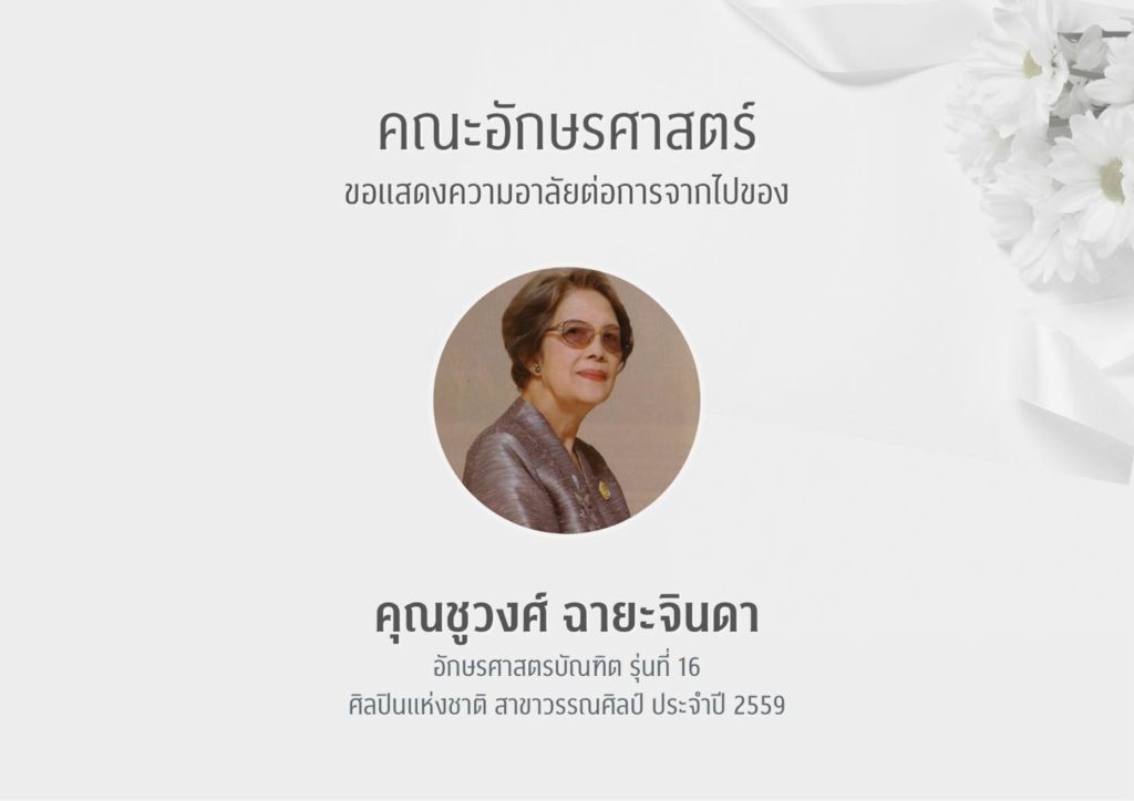 คณะอักษรศาสตร์ขอแสดงความอาลัยต่อการจากไปของคุณชูวงศ์ ฉายะจินดา อักษรศาสตรบัณฑิต รุ่นที่ 16 ศิลปินแห่งชาติ สาขาวรรณศิลป์ ประจำปี 2559