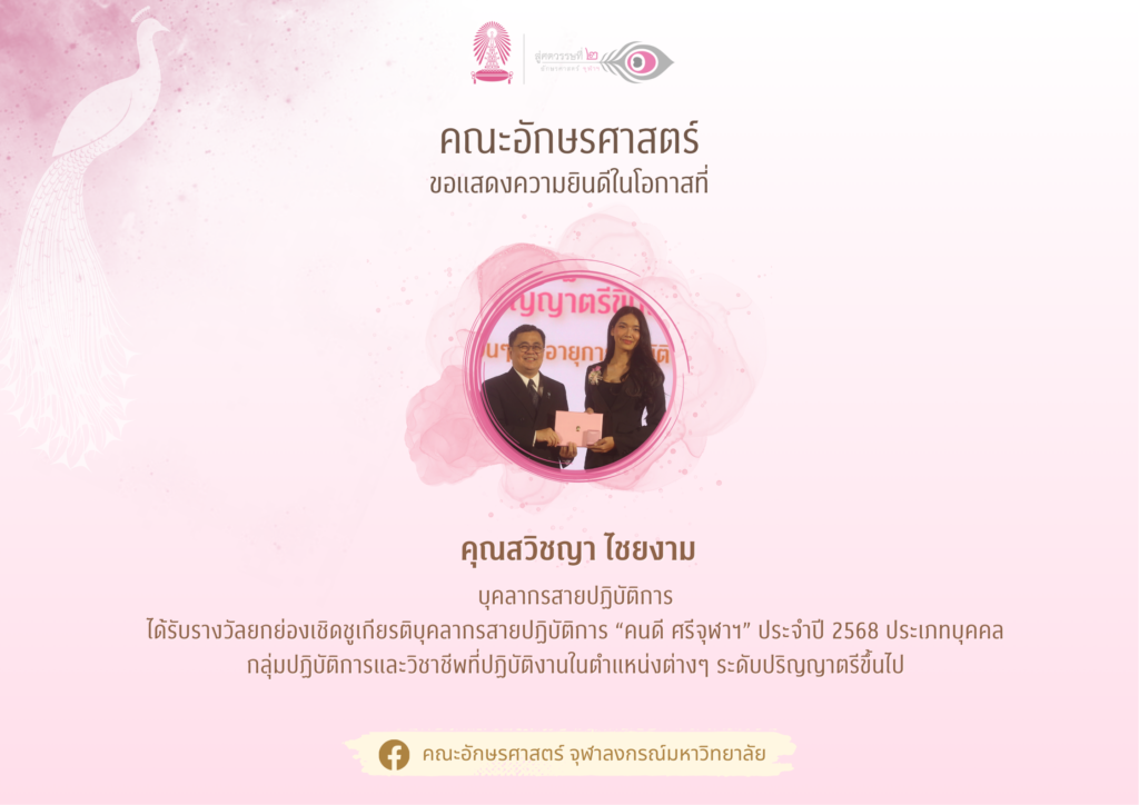 ขอแสดงความยินดีแก่คุณสวิชญา ไชยงาม ได้รับรางวัลยกย่องเชิดชูเกียรติบุคลากรสายปฏิบัติการ “คนดี ศรีจุฬาฯ” ประจำปี 2568