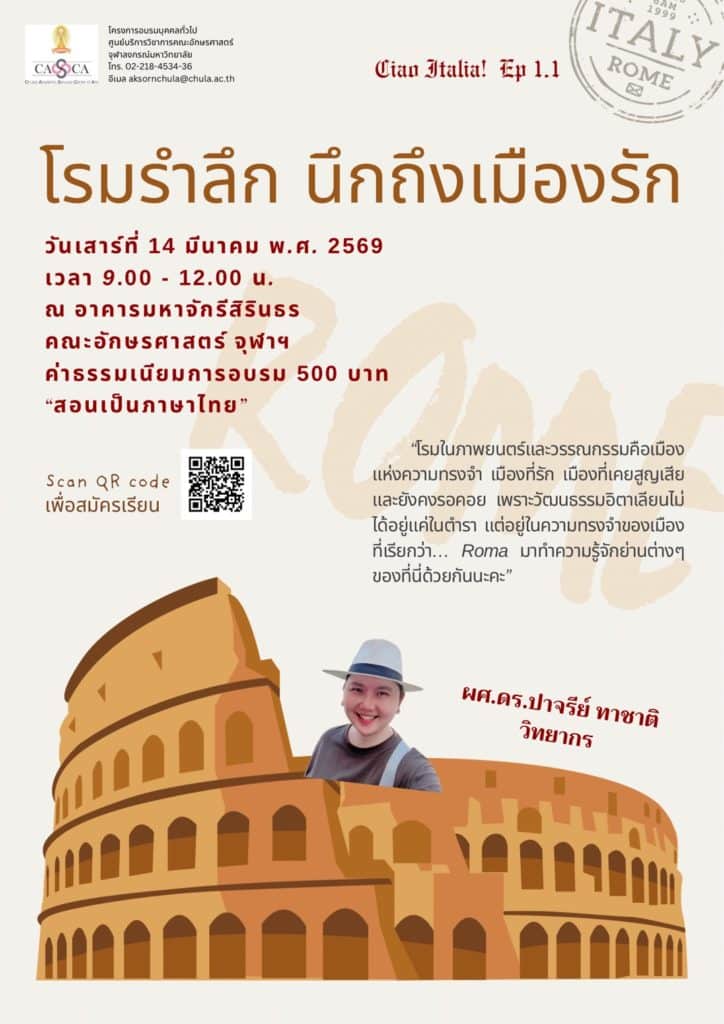 ชวนเปิดประตูสู่ “กรุงโรม” ผ่านมุมมองใหม่ที่มากกว่าการท่องเที่ยว! คอร์สนี้จะพาผู้เรียนสำรวจเมืองโรมในฐานะ “ตัวบททางวัฒนธรรม” (Cultural Text) ผ่านภาพยนตร์ วรรณกรรม และเรื่องเล่า เพื่อทำความเข้าใจโรมในมิติของความทรงจำ ความรัก การสูญเสีย และความหมายเชิงสัญลักษณ์ของพื้นที่เมือง ผู้เข้าร่วมจะได้เรียนรู้ภาษาและวัฒนธรรมอิตาเลียนไปพร้อมกัน ผ่านการวิเคราะห์ภาพของโรมที่แตกต่างจากภาพจำในสื่อท่องเที่ยวทั่วไป เหมาะสำหรับผู้ที่สนใจอิตาลี ภาพยนตร์ วรรณกรรม และการเรียนรู้แบบสหวิทยาการ. วัตถุประสงค์• เรียนรู้วัฒนธรรมอิตาเลียนผ่านภาพยนตร์และวรรณกรรม• ทำความเข้าใจกรุงโรมในฐานะพื้นที่เชิงสัญลักษณ์• บูรณาการความรู้ด้านภาษาอิตาเลียนกับศิลปวัฒนธรรม• ส่งเสริมการเรียนรู้แบบไร้พรมแดนในศตวรรษที่ 21. หัวข้อการอบรมโรมในภาพยนตร์และวรรณกรรม โรมในฐานะ “เมือง–ตัวละคร” การอ่านและตีความเมืองในเชิงวัฒนธรรม ภาพของโรมกับสื่อร่วมสมัย รับสมัครตั้งแต่: วันนี้เป็นต้นไป เรียนในรูปแบบ: อบรมในห้องเรียน (On-site) วันเสาร์ที่ 14 มีนาคม พ.ศ. 2569 เวลา 9.00 – 12.00 น. รวม 3 ชั่วโมง สถานที่: อาคารมหาจักรีสิรินธร คณะอักษรศาสตร์ จุฬาฯ ราคาสมัคร: 500 บาท การอบรมเป็นภาษาไทย____________________________สมัครได้ที่ >>>https://cascachula.com/detail_courses/320( ผู้เรียนใหม่กรุณาสมัครสมาชิกก่อน)**หมายเหตุ1. ให้ผู้สมัครกรอกข้อมูล ชื่อ-นามสกุล ให้ครบถ้วน (มีผลในการออกใบประกาศ)2. ระบุข้อมูลที่อยู่ปัจจุบันให้ถูกต้องครบถ้วน เพื่อใช้ในการจัดส่งเอกสารประกอบการเรียนไปถึงผู้สมัคร