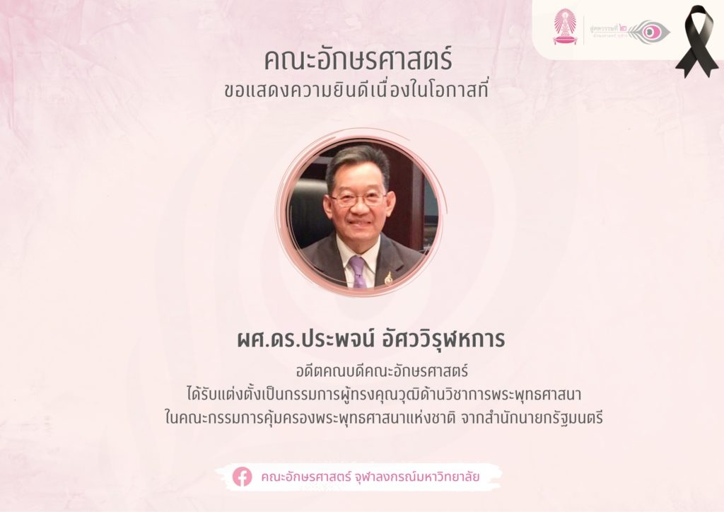 คณะอักษรศาสตร์ ขอแสดงความยินดีเนื่องในโอกาสที่ ผู้ช่วยศาสตราจารย์ ดร.ประพจน์ อัศววิรุฬหการ อดีตคณบดีคณะอักษรศาสตร์ ได้รับแต่งตั้งเป็นกรรมการผู้ทรงคุณวุฒิด้านวิชาการพระพุทธศาสนา ในคณะกรรมการคุ้มครองพระพุทธศาสนาแห่งชาติ จากสำนักนายกรัฐมนตรี คำสั่งนายกรัฐมนตรี ที่ 1/2569 เรื่อง แต่งตั้งประธานกรรมการและกรรมการผู้ทรงคุณวุฒิ ในคณะกรรมการคุ้มครองพระพุทธศาสนาแห่งชาติ สั่ง ณ วันที่ 30 มกราคม 2569