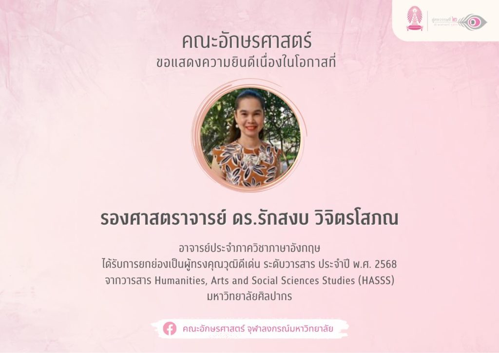 คณะอักษรศาสตร์ขอแสดงความยินดีเนื่องในโอกาสที่รองศาสตราจารย์ ดร.รักสงบ วิจิตรโสภณ อาจารย์ประจำภาควิชาภาษาอังกฤษ ได้รับการยกย่องเป็นผู้ทรงคุณวุฒิดีเด่น ระดับวารสาร ประจำปี พ.ศ. 2568 จากวารสาร Humanities, Arts and Social Sciences Studies (HASSS) มหาวิทยาลัยศิลปากร