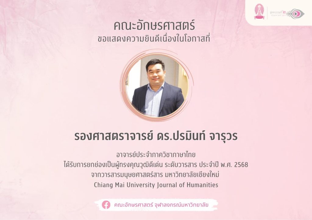 คณะอักษรศาสตร์ขอแสดงความยินดีเนื่องในโอกาสที่ รองศาสตราจารย์ ดร.ปรมินท์ จารุวร อาจารย์ประจำภาควิชาภาษาไทย ได้รับการยกย่องเป็นผู้ทรงคุณวุฒิดีเด่น ระดับวารสาร ประจำปี พ.ศ. 2568 จากวารสารมนุษยศาสตร์สาร มหาวิทยาลัยเชียงใหม่ (Chiang Mai University Journal of Humanities)