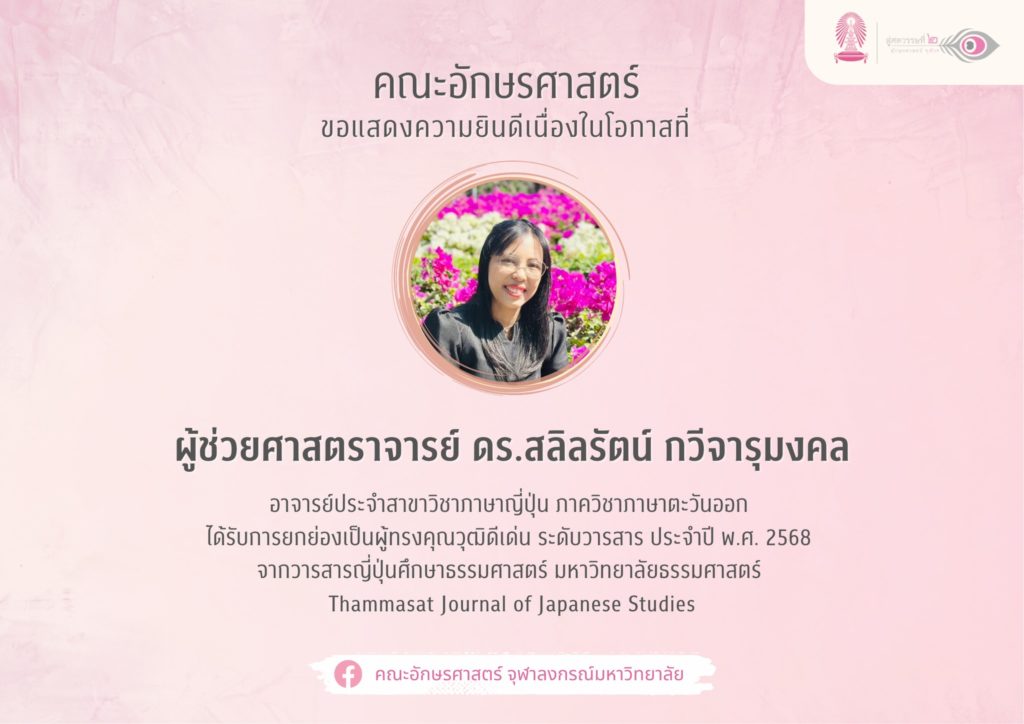 คณะอักษรศาสตร์ขอแสดงความยินดีเนื่องในโอกาสที่ ผู้ช่วยศาสตราจารย์ ดร.สลิลรัตน์ กวีจารุมงคล อาจารย์ประจำสาขาวิชาภาษาญี่ปุ่น ภาควิชาภาษาตะวันออก ได้รับการยกย่องเป็นผู้ทรงคุณวุฒิดีเด่น ระดับวารสาร ประจำปี พ.ศ. 2568 จากวารสารญี่ปุ่นศึกษาธรรมศาสตร์ มหาวิทยาลัยธรรมศาสตร์ Thammasat Journal of Japanese Studies