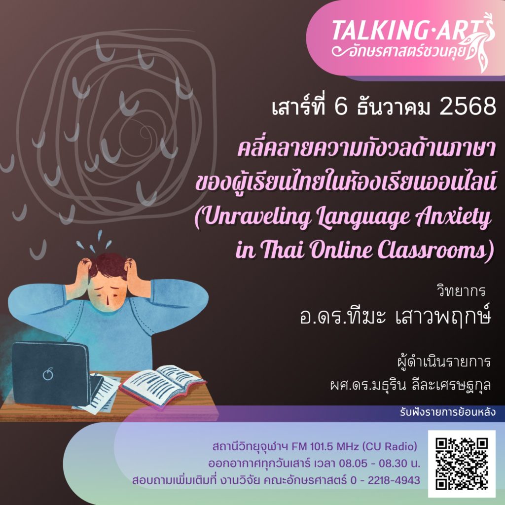 รายการวิทยุ “Talking Arts: อักษรศาสตร์ชวนคุย” จัดโดยกลุ่มภารกิจงานวิจัยและพัฒนาวิชาการ เพื่อเผยแพร่ผลงานวิจัยของคณาจารย์และนิสิตระดับบัณฑิตศึกษา ท่านสามารถติดตามรายการได้ทุกเช้าวันเสาร์ เวลา 08.05 – 08.30 น. ทางสถานีวิทยุจุฬาฯ FM 101.5 MHz (CU Radio) และในรูปแบบ Podcast บน Spotify และ Apple Podcast : https://shorturl.asia/26HzK