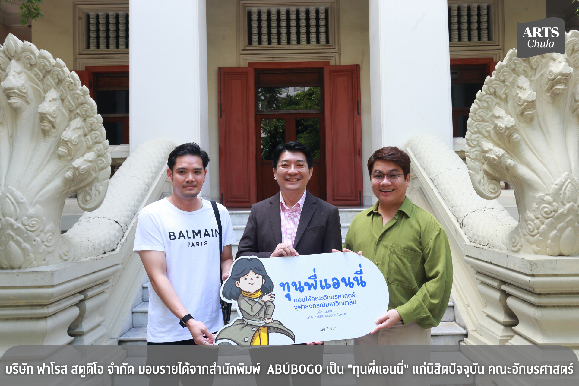 วันที่ 16 ตุลาคม พ.ศ. 2568 คุณณัฏฐ์ กลิ่นมาลีหรือพี่ฟาโรส (อบ.73) ศิษย์เก่าคณะอักษรศาสตร์ จุฬาลงกรณ์มหาวิทยาลัย จากบริษัท ฟาโรส สตูดิโอ จำกัด ได้กรุณามอบรายได้จากสำนักพิมพ์ ABÚBOGO เป็น “ทุนพี่แอนนี่” สนับสนุนค่าอาหารกลางวันแก่น้องๆ นิสิตปัจจุบัน เพื่อเป็นที่รำลึกถึงคุณวรชัย วงษ์พรหมหรือพี่แอนนี่ (อบ. 74) โดยรศ.ดร.สุรเดช โชติอุดมพันธ์ คณบดีคณะอักษรศาสตร์ เป็นผู้รับมอบ