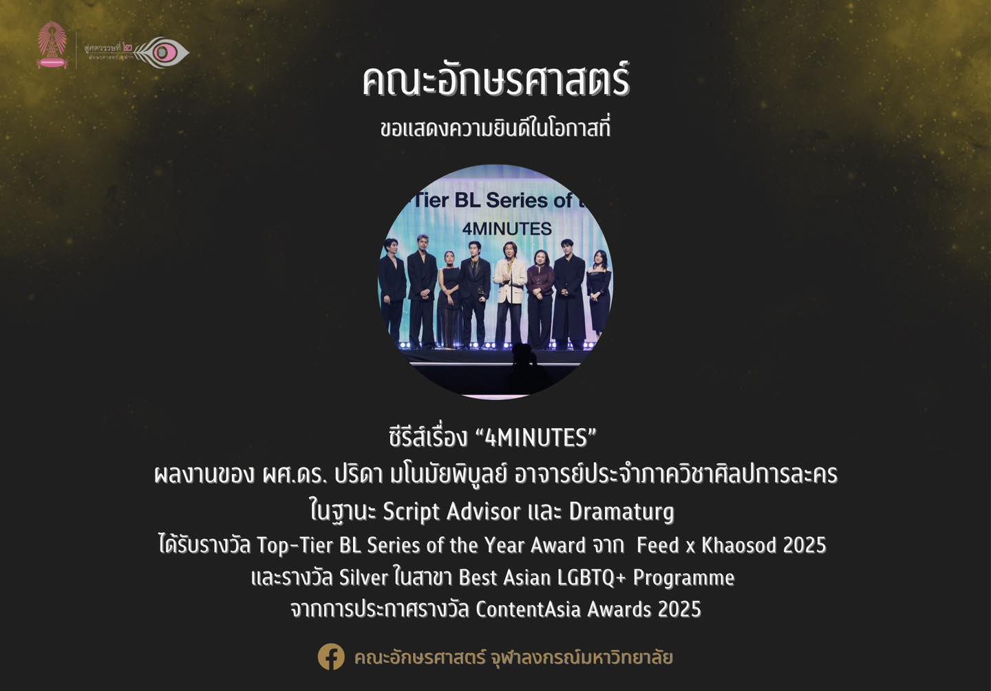 คณะอักษรศาสตร์ขอแสดงความยินดีในโอกาสที่ซีรีส์เรื่อง “4MINUTES” ผลงานของ ผศ.ดร. ปริดา มโนมัยพิบูลย์ อาจารย์ประจำภาควิชาศิลปการละคร ในฐานะ Script Advisor และ Dramaturg ได้รับรางวัล Top-Tier BL Series of the Year Award จาก Feed x Khaosod 2025 และรางวัล Silver ในสาขา Best Asian LGBTQ+ Programme จากการประกาศรางวัล ContentAsia Awards 2025