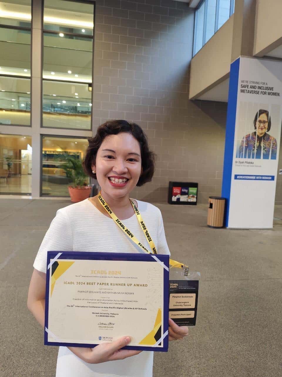 อาจารย์ ดร.พิมพ์พจน์ สีลาเขต และคุณเรย์ฮาน มูซา โนเวียน นิสิตระดับปริญญาโท ภาควิชาบรรณารักษศาสตร์ได้รับรางวัล ICADL 2024 best paper runner up บทความยอดเยี่ยมรองชนะเลิศอันดับหนึ่ง