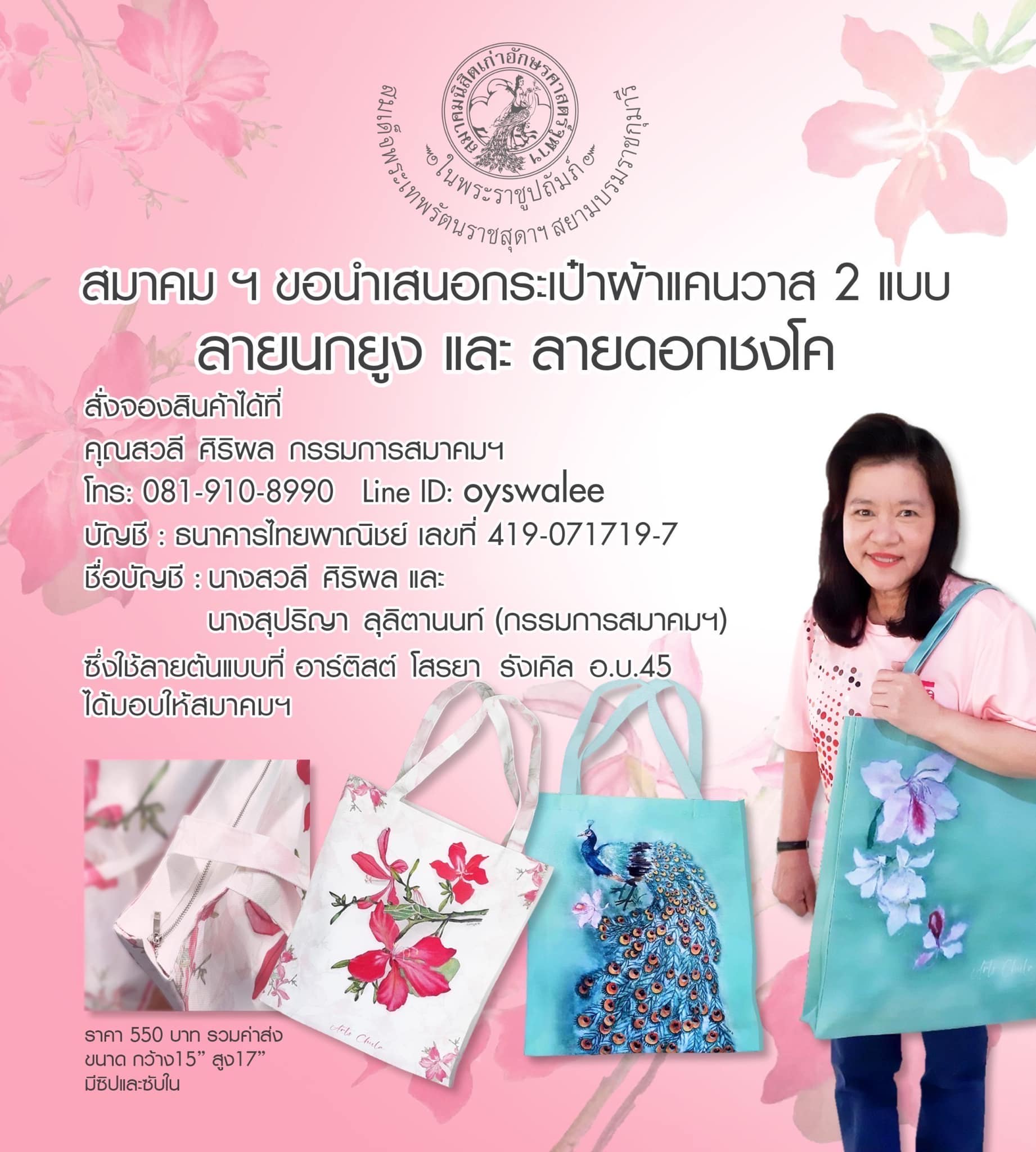 – สมาคมฯ ขอนำเสนอกระเป๋าผ้าแคนวาส 2 รูปแบบ: ลายนกยูง และ ลายชงโค