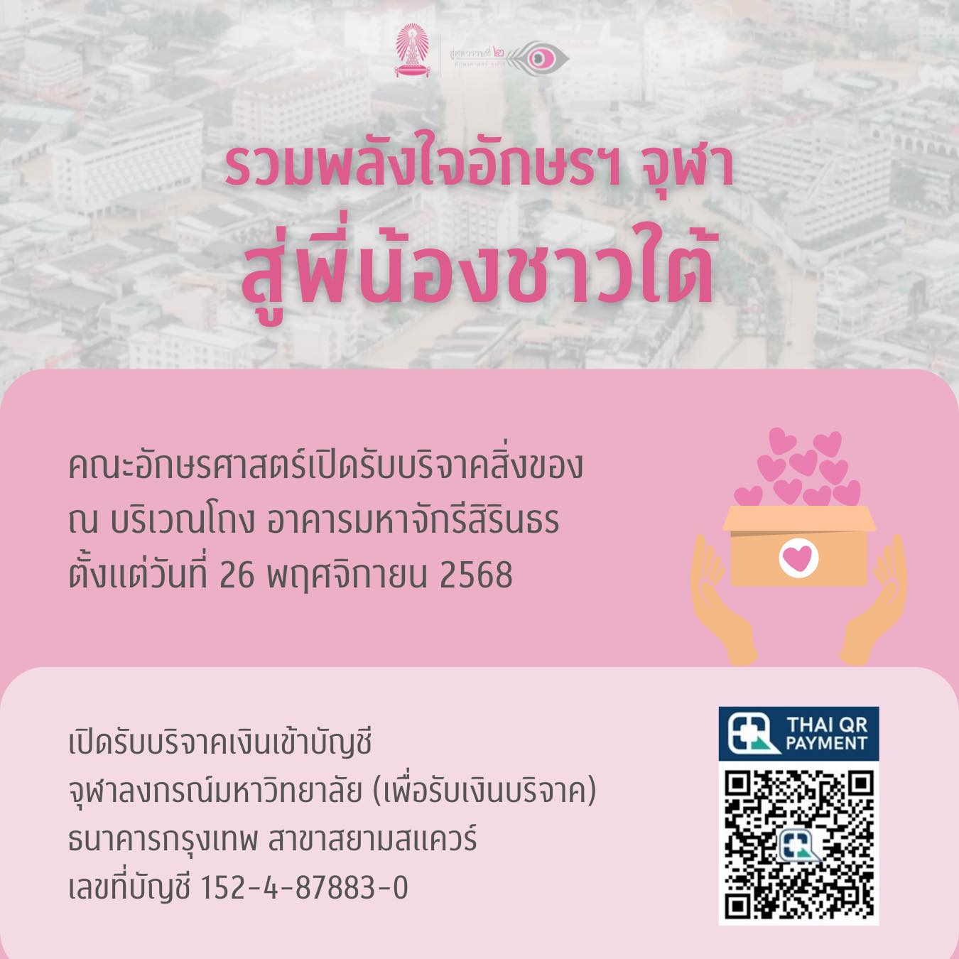 คณะอักษรศาสตร์ขอเชิญทุกท่านร่วมบริจาคสิ่งของและเงินเพื่อช่วยเหลือพี่น้องภาคใต้