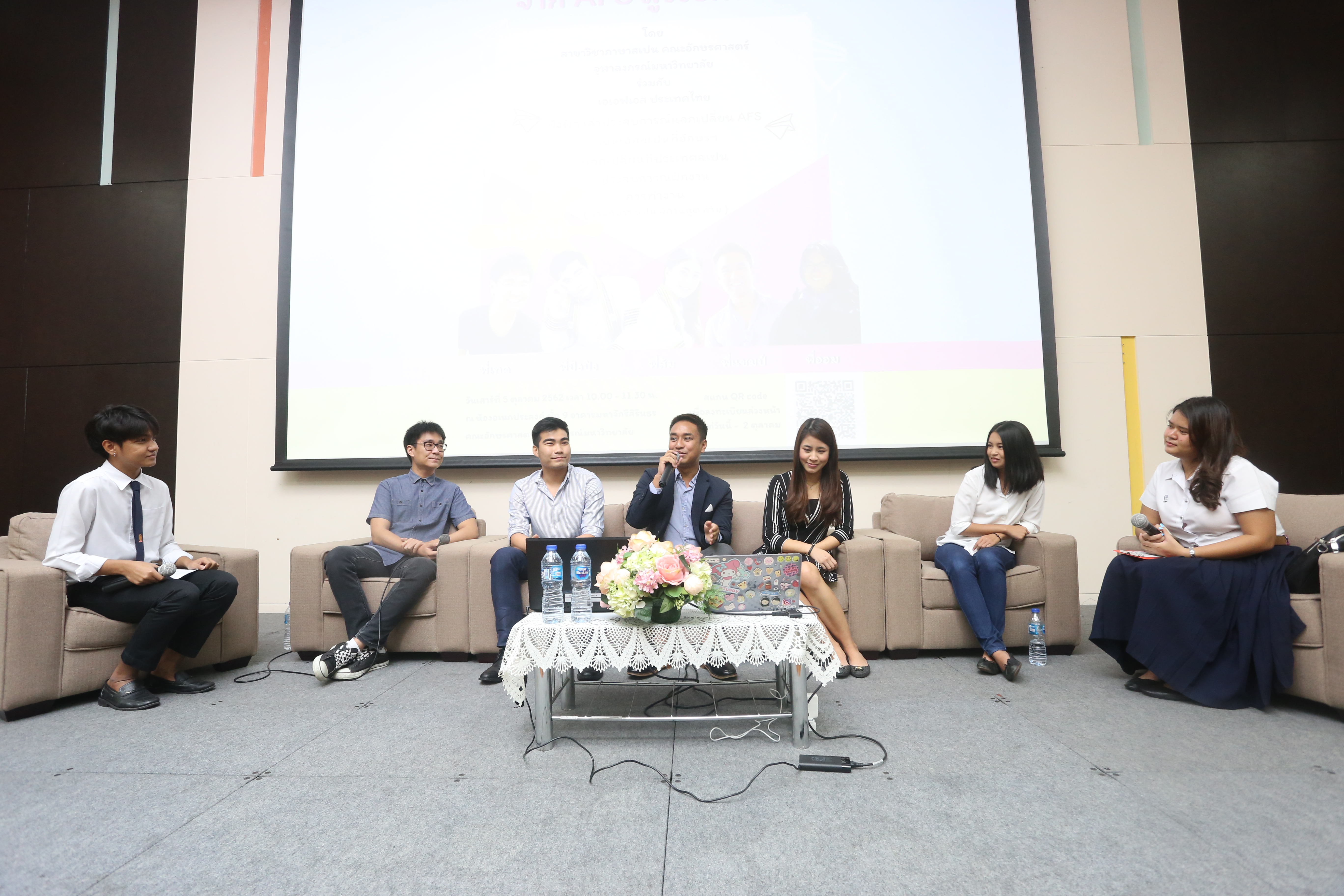 โดยวิทยากรทั้ง 5 ท่านมาจากหลากหลายรุ่นที่เข้าเรียนทั้งในหลักสูตรไทย ไม่ว่าจะเป็นแบบสอบเข้าคณะอักษรฯ ก่อน แล้วเลือกเอกสเปนตอนปี 2 (ปัจจุบันคือ TCAS รอบ 3 และ 4) หรือรับตรงแบบพิเศษ (TCAS รอบ 2) รวมถึงหลักสูตรนานาชาติ (BALAC) งานนี้ได้รับความสนใจจากน้องๆ เอเอฟเอสที่เคยไปแลกเปลี่ยนหรือกำลังจะไปแลกเปลี่ยนในประเทศที่ใช้ภาษาสเปนเป็นภาษาราชการ ผู้ปกครองและเจ้าหน้าที่จากเอเอฟเอสประเทศไทยเข้าร่วมกว่า 100 คน