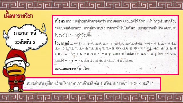 มีให้เลือกตั้งแต่วิชาภาษาเกาหลี ระดับต้น 1-4 และระดับกลาง 2