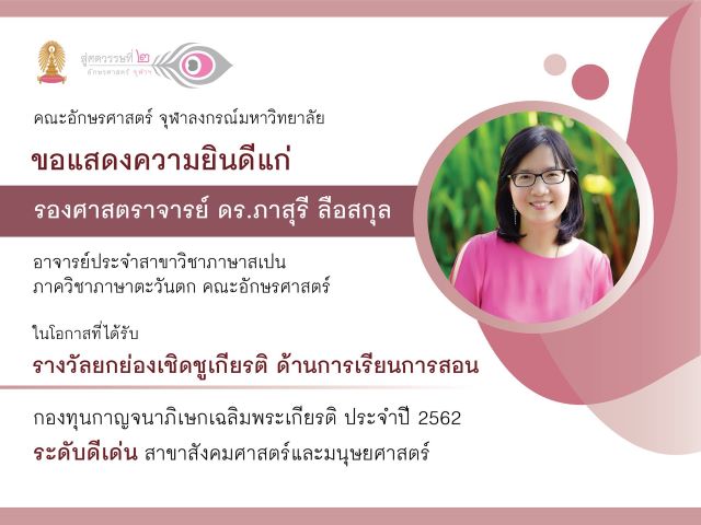 ข่าวเด่นของนิสิต/บุคลากร, ภาพข่าวกิจกรรม ขอแสดงความยินดีกับ รศ.ดร.ภาสุรี ลือสกุล อาจารย์ประจำสาขาวิชาภาษาสเปน July 9, 2020 / คณะอักษรศาสตร์ขอแสดงความยินดีกับ รศ.ดร.ภาสุรี ลือสกุล อาจารย์ประจำสาขาวิชาภาษาสเปน ภาควิชาภาษาตะวันตก ในโอกาสที่ได้รับรางวัลยกย่องเชิดชูเกียรติด้านการเรียนการสอน กองทุนกาญจนาภิเษกเฉลิมพระเกียรติ ประจำปี 2562 ระดับดีเด่น สาขาสังคมศาสตร์และมนุษยศาสตร์