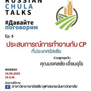 Russian Chula Talks Давайте поговорим Ep. 5 ร่วมพูดคุยกับคุณมงคลชัย เอี่ยมอุไร ผู้จัดการฝ่ายการค้าวัตถุดิบอาหารสัตว์ เขตประเทศรัสเซีย บริษัทซีพีเทรดดิ้ง โอเวอร์ซีส์ ในหัวข้อ “ประสบการณ์การทำงานกับ CP ที่ประเทศรัสเซีย” คลิกดูที่นี่